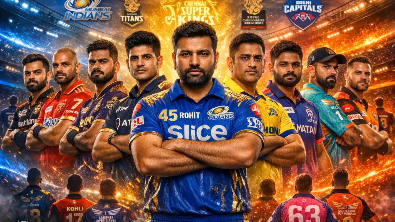 Create an ultra-realistic IPL 2026 mega poster featuring all 10 teams using the original player face with strict face lock (100% identical face, no reshaping, no beautification, preserve exact skin texture, pores, proportions, light beard), multiple young male cricketers styled as different team captains wearing official 2026-inspired jerseys: Mumbai Indians (blue-gold “45 ROHIT SHARMA”), Gujarat Titans (navy-gold “7 SHUBMAN GILL”), Chennai Super Kings (yellow-blue “7 MS DHONI”), Royal Challengers Bangalore (red-black-gold “18 VIRAT KOHLI”), Kolkata Knight Riders (purple-gold “19 SHREYAS IYER”), Delhi Capitals (blue-red “17 RISHABH PANT”), Rajasthan Royals (pink-blue “63 SANJU SAMSON”), Punjab Kings (red-gold “7 SHIKHAR DHAWAN”), Lucknow Super Giants (teal-orange “1 KL RAHUL”), Sunrisers Hyderabad (orange-black “8 AIDEN MARKRAM”), composition: central dominant hero figure (front-facing, arms crossed) surrounded by other players in layered depth positions forming a circular or V-shaped arrangement, with smaller back-view silhouettes subtly integrated, background: grand cinematic stadium with split multi-color energy zones representing each team, glowing team names or logos blended into the environment, dynamic lighting matching each team’s color (blue, yellow, red, purple, pink, orange, teal, gold accents), effects: energy streaks, smoke, sparks, particles blending across teams, dramatic high-contrast lighting with strong rim lights and ultra-sharp faces (no blur), color grading: high saturation cinematic multi-color harmony while maintaining team identity, 85mm lens shallow depth of field, ultra-detailed textures, 8K resolution, professional sports poster composition, mood: epic, powerful, championship clash, signature “KShare.in” bottom-left in thin cursive white/off-white --ar 16:9 --no face blur, identity change, distortion, plastic skin, CGI look, extra limbs, bad anatomy, low resolution